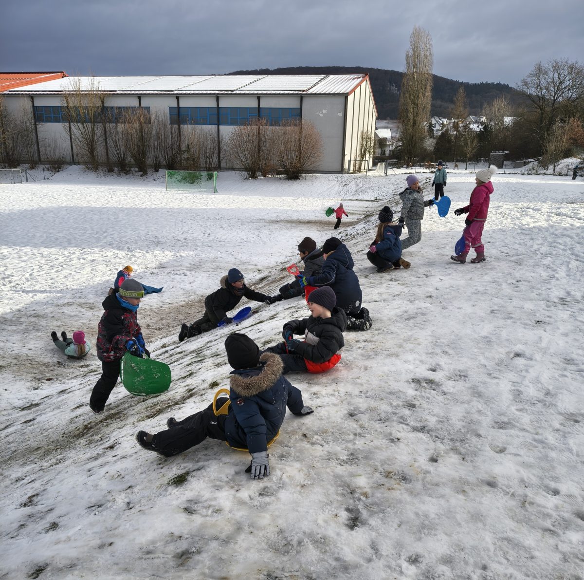 Nachdem es gleich in der ersten Woche nach den Ferien wunderbar geschneit hatte, durften die zweiten Klassen einen Sportunterricht der besonderen Art erleben: Alle Kinder brachten ihre Schneerutscher mit und nutzen den Abhang zum Bolzplatz als Rodelbahn. Am Ende der Stunde haben die Kinder gemerkt: Das Rodeln hat nicht nur Spaß gemacht, sondern sie haben dabei viel gelernt und trainiert: Ausdauer, Orientierungsfähigkeit und auch Hilfsbereitschaft und Rücksichtnahme. Nun hoffen alle noch einmal auf Neuschnee.